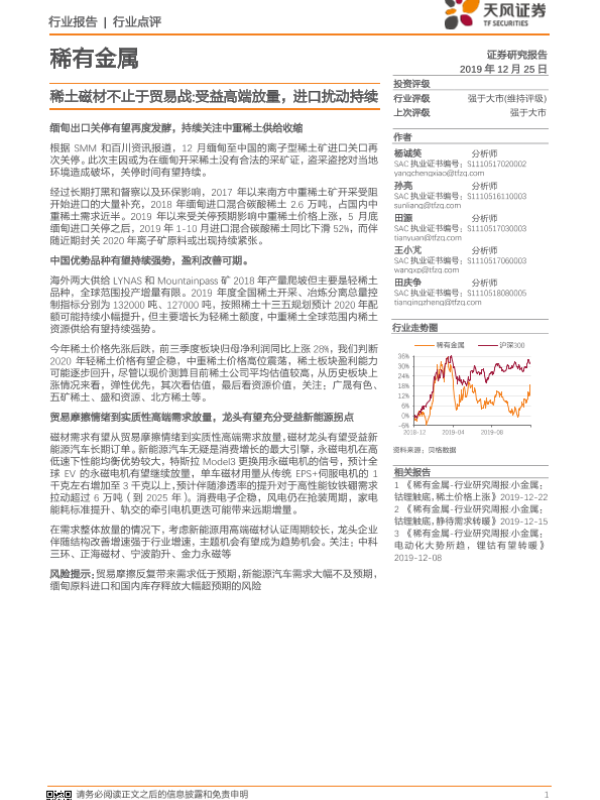 【天风证券】【20191225】稀有金属行业点评:稀土磁材不止于贸易战 受益高端放量,进口扰动持续-2页 行业研究