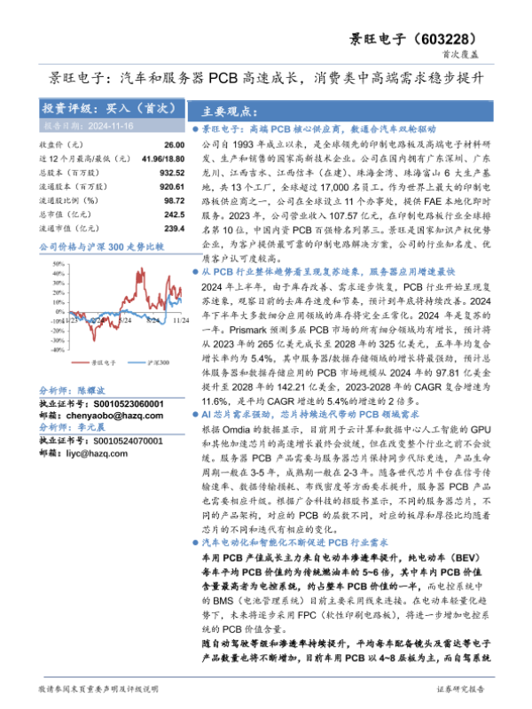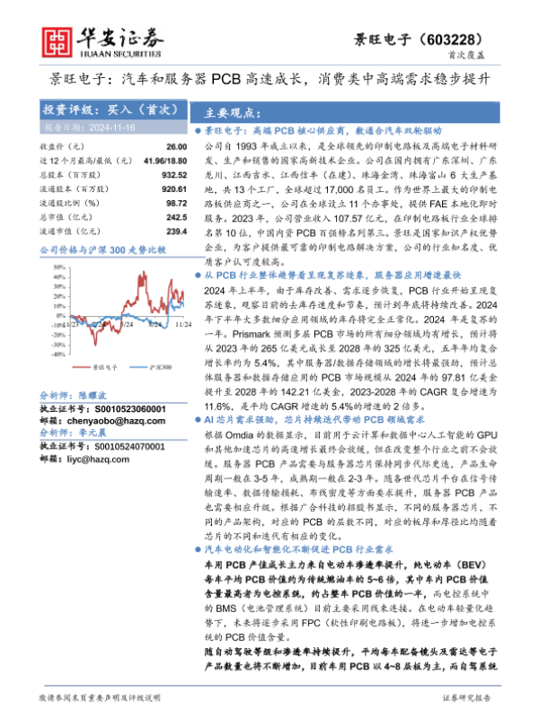 【华安证券】【20241116】景旺电子(603228)汽车和服务器PCB高速成长,消费类中高端需求稳步提升-28页 行业研究