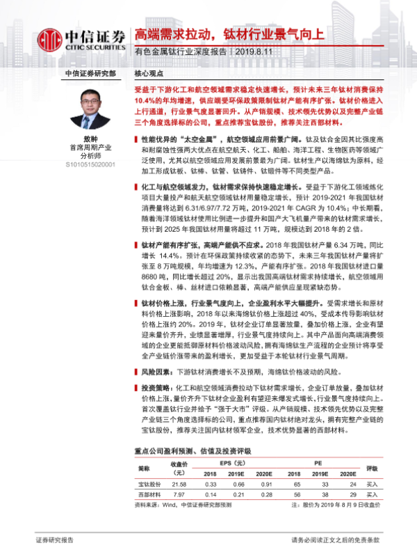 【中信证券】【20190811】20190811-中信证券-有色金属钛行业深度报告:高端需求拉动,钛材行业景气向上-40页 行业研究