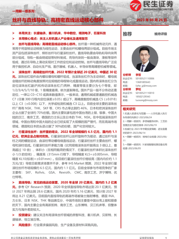 【民生证券】【20230626】机械行业一周解一惑系列:丝杆与直线导轨,高精密直线运动核心部件-26页 行业研究