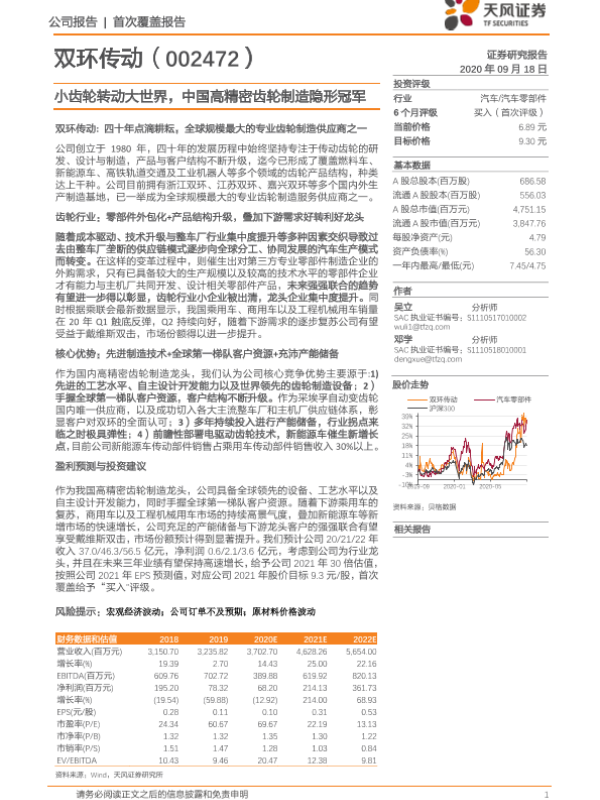 【天风证券】【20200918】双环传动-小齿轮转动大世界,中国高精密齿轮制造隐形冠军-25页 行业研究