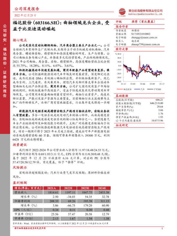 【东亚前海证券】【20221225】福达股份:曲轴领域龙头企业,受益于比亚迪混动崛起-24页 行业研究