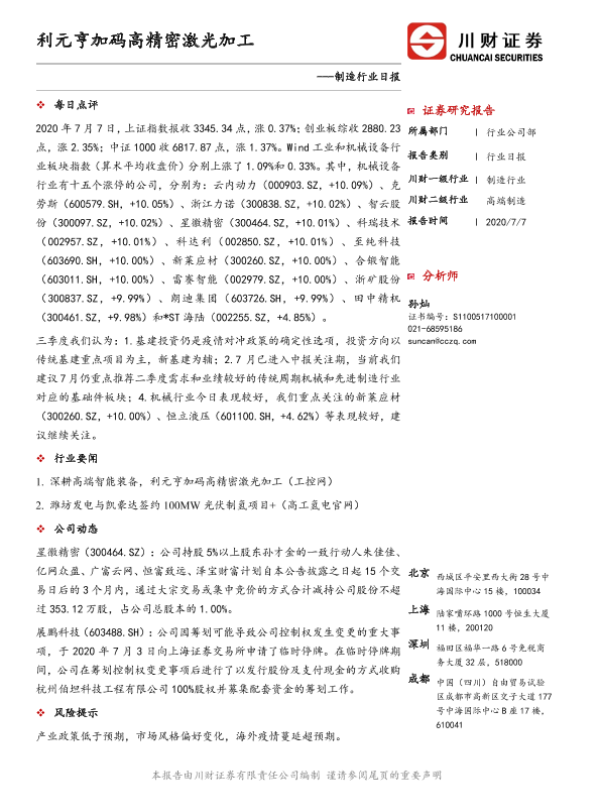 【川财证券】【20200707】制造行业日报:利元亨加码高精密激光加工-2页 证券期货研究报告
