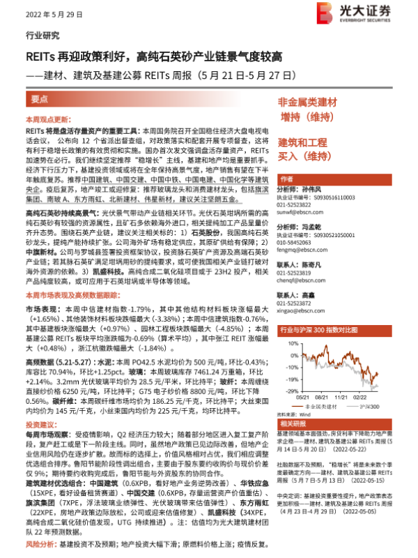 【光大证券】【20220529】建材、建筑及基建公募REITs周报:REITs再迎政策利好,高纯石英砂产业链景气度较高-20页 行业研究