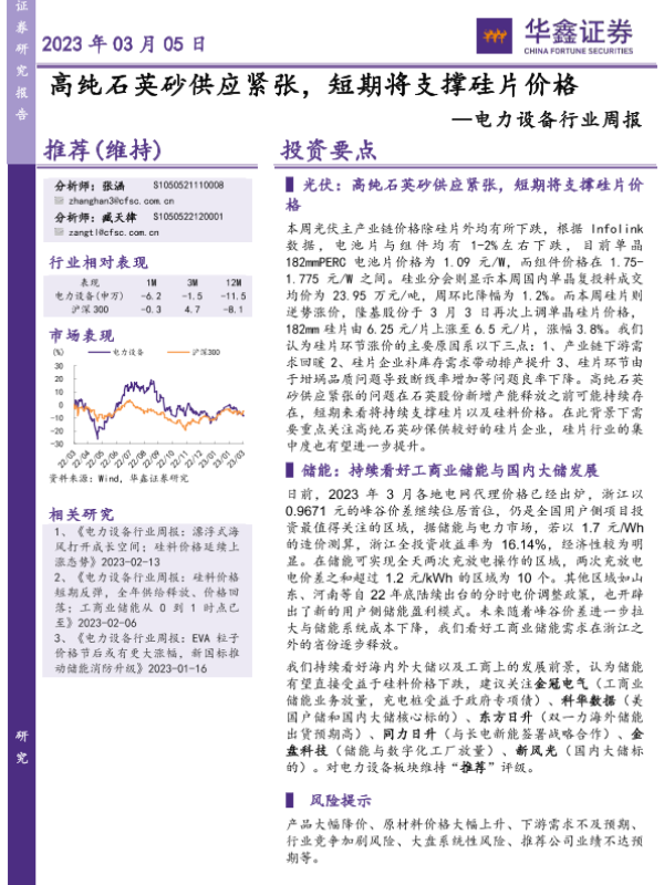 【华鑫证券】【20230305】20230305-华鑫证券-电力设备行业周报:高纯石英砂供应紧张,短期将支撑硅片价格-17页 行业研究