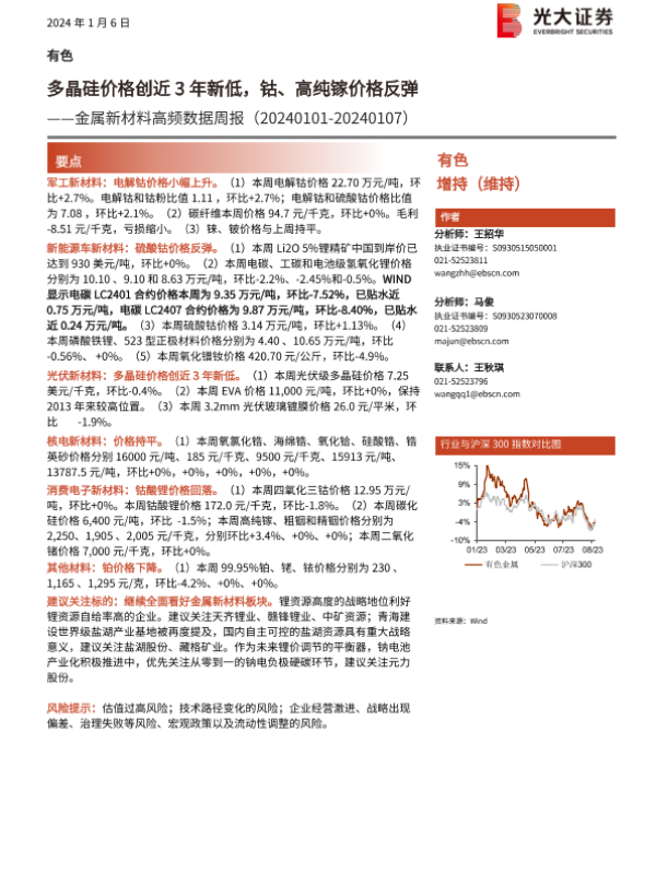 【光大证券】【20240106】金属新材料高频数据周报:多晶硅价格创近3年新低,钴、高纯镓价格反弹-19页 行业研究