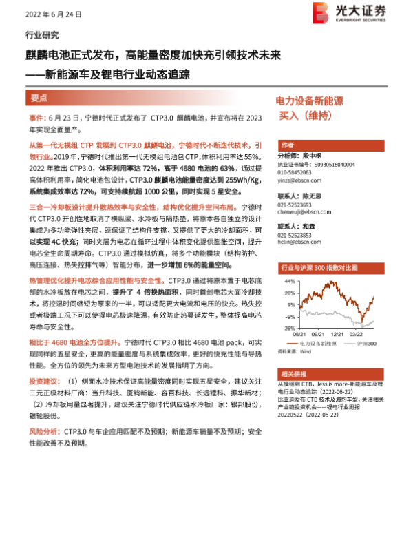 【光大证券】【20220624】新能源车及锂电行业动态追踪:麒麟电池正式发布,高能量密度加快充引领技术未来-2页 行业研究