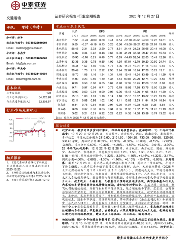 【中泰证券】【202512】交通运输-航空即将迎来假期催化,中长期资金入市推荐高速-24页 证券期货研究报告