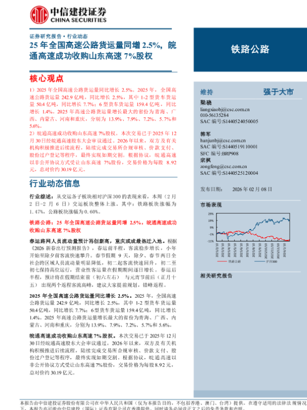 【中信建投证券】【202602】铁路公路行业:25年全国高速公路货运量同增2.5%股权-11页 证券期货研究报告