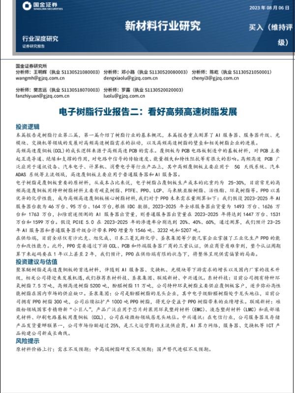 【国金证券】【20230101】国金证券:新材料行业深度研究-电子树脂行业报告二-看好高频高速树脂发展-25页 行业研究