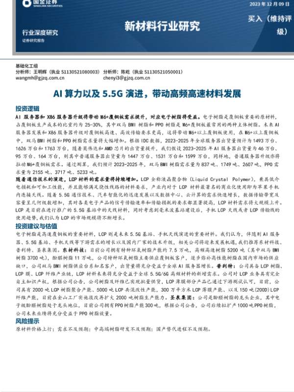 【国金证券】【20231209】新材料行业研究:AI算力以及5.5G演进,带动高频高速材料发展-21页 行业研究