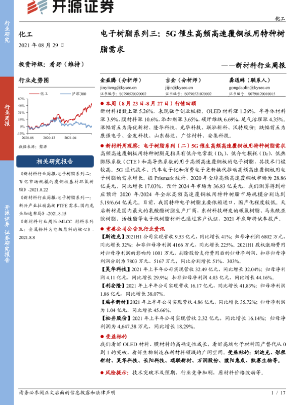 【开源证券】【20210829】电子树脂系列三:5G催生高频高速覆铜板用特种树脂需求-17页 行业研究
