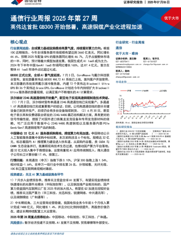 【国信证券】【20250706】通信行业周报2025年第27周:英伟达首批GB300开始部署,高速铜缆产业化进程加速-16页 行业研究