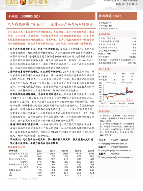 【海通证券】【20241218】卡倍亿(300863)汽车线缆领域小巨人,全球化产品外延双轮驱动-15页 行业研究