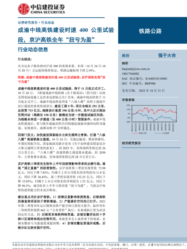 【中信建投证券】【20221031】成渝中线高铁建设时速400公里试验段,京沪高铁全年“扭亏为盈”-12页 行业研究