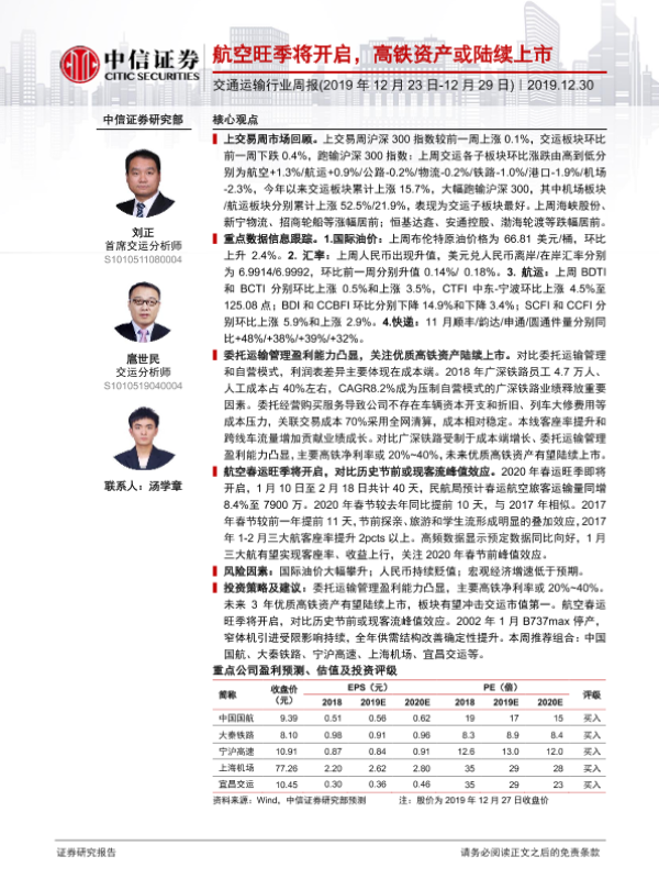 【中信证券】【20191230】交通运输行业周报:航空旺季将开启,高铁资产或陆续上市-24页 行业研究