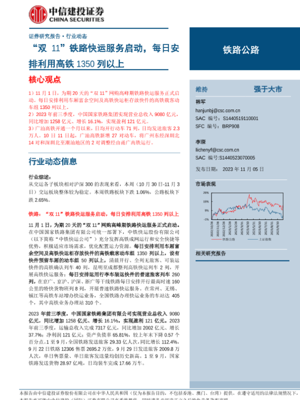 【中信建投证券】【20231105】铁路公路行业动态:“双11”铁路快运服务启动,每日安排利用高铁1350列以上-19页 行业研究
