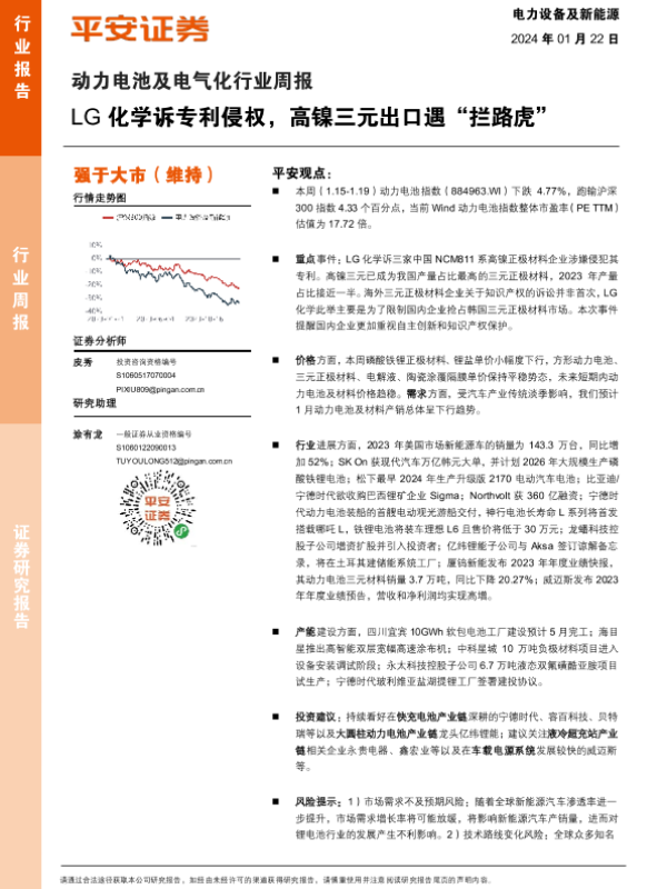 【平安证券】【20240122】动力电池及电气化行业周报:LG化学诉专利侵权,高镍三元出口遇“拦路虎”-12页 行业研究