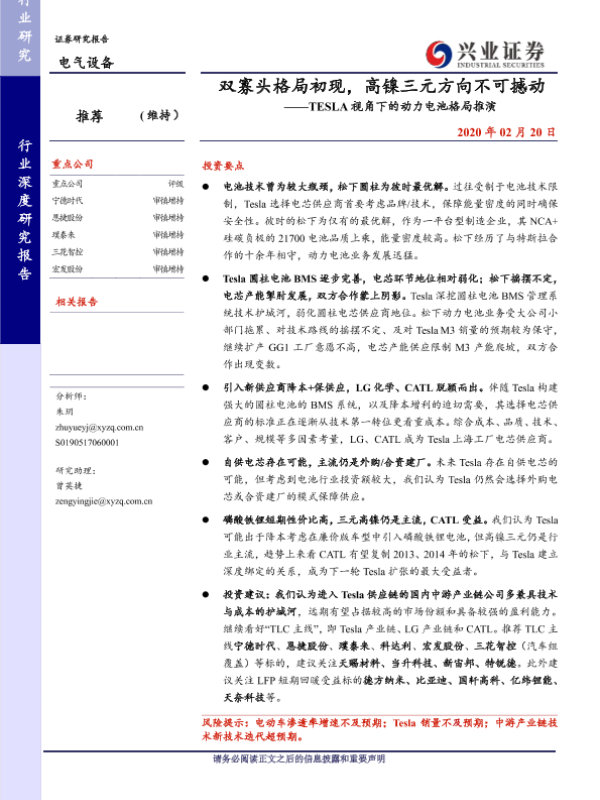 【兴业证券】【20200220】双寡头格局初现,高镍三元方向不可撼动——TESLA视角下的动力电池格局推演-39页 行业研究