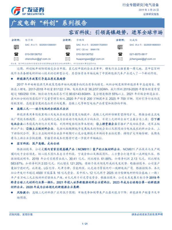 【广发证券】【20190325】容百科技:引领高镍趋势,进军全球市场-21页 行业研究
