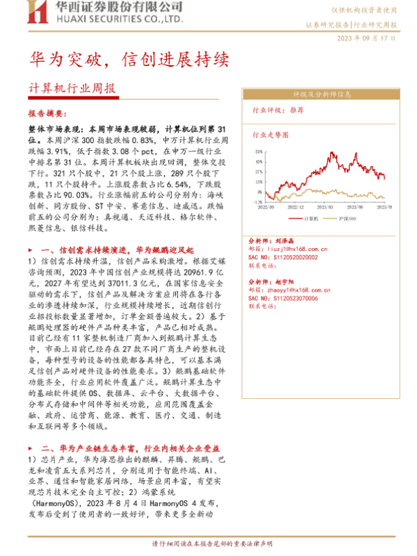 【华西证券】【20230917】20230917-华西证券-计算机行业周报:华为突破,信创进展持续-30页 行业研究