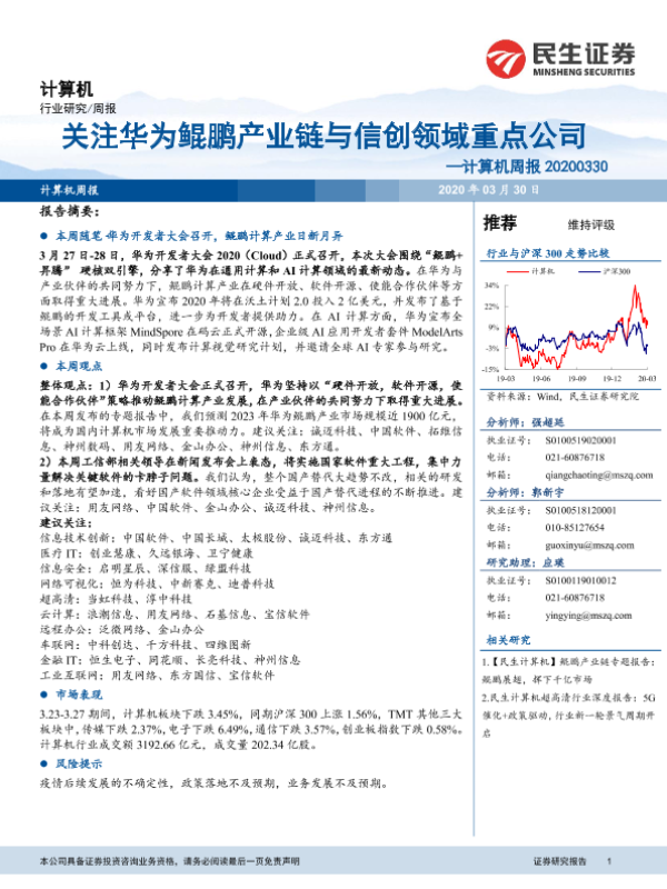 【民生证券】【20200330】计算机周报:关注华为鲲鹏产业链与信创领域重点公司-17页 行业研究
