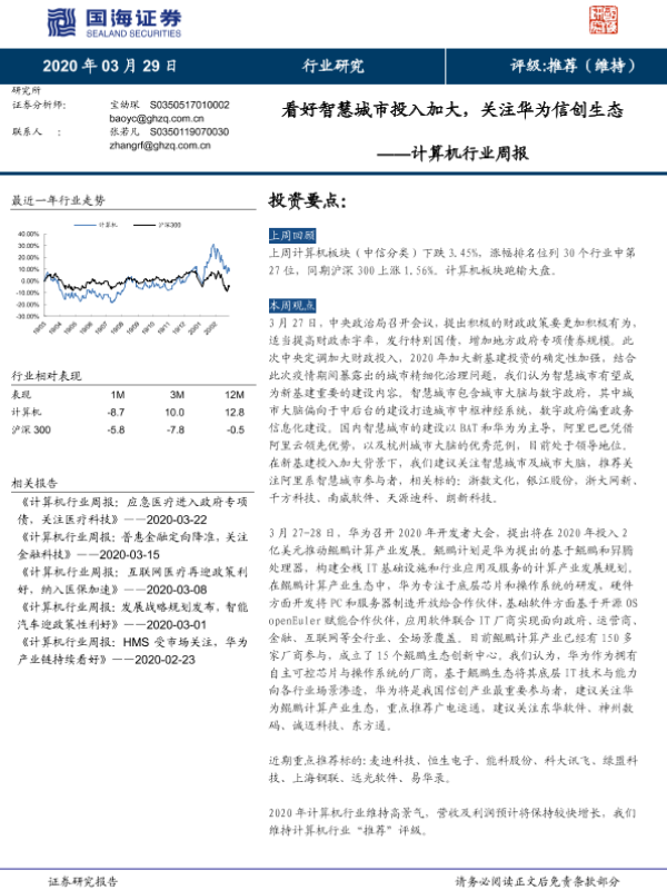 【国海证券】【20200329】计算机行业周报:看好智慧城市投入加大,关注华为信创生态-14页 行业研究