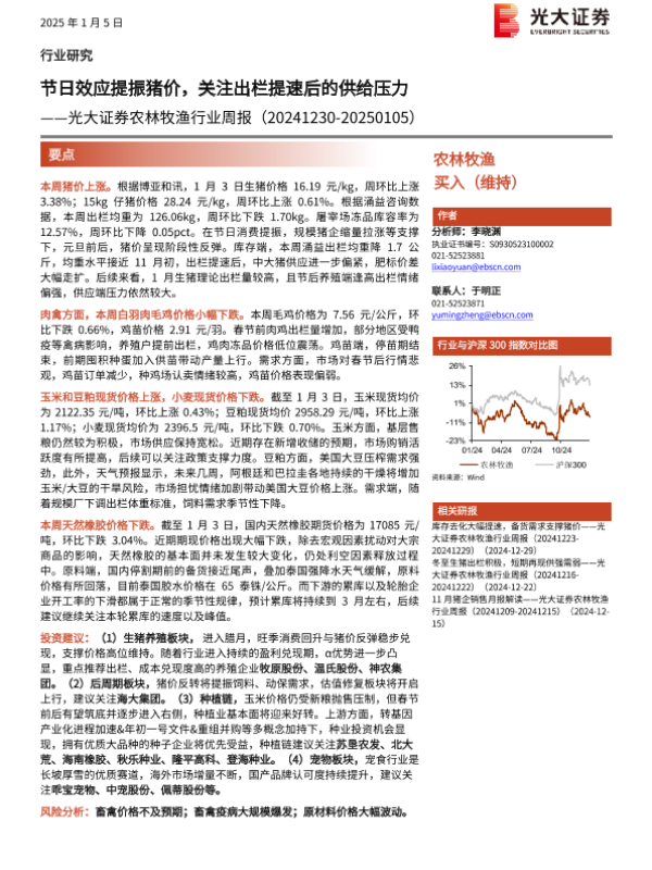 【光大证券】【20250105】20250105-光大证券-农林牧渔行业周报:节日效应提振猪价,关注出栏提速后的供给压力-12页 行业研究
