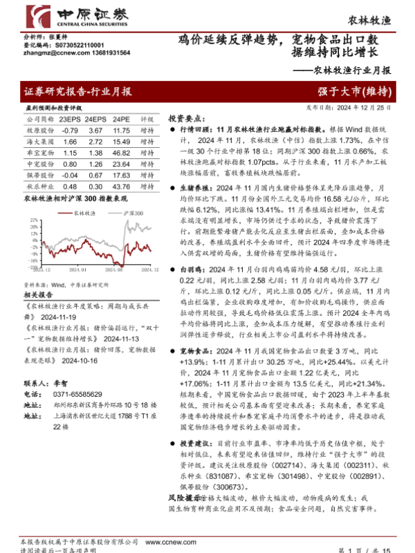 【中原证券】【20241225】农林牧渔行业月报:鸡价延续反弹趋势,宠物食品出口数据维持同比增长-15页 行业研究