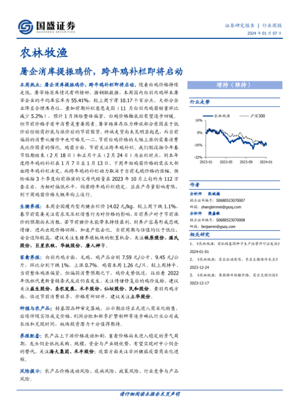 【国盛证券】【20240107】20240107-国盛证券-农林牧渔行业周报:屠企消库提振鸡价,跨年鸡补栏即将启动-13页 行业研究