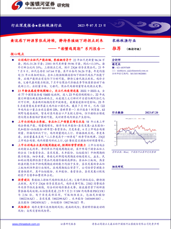 【银河证券】【20230723】农林牧渔行业:“读懂鸡周期”系列报告一:禽流感下种源紧张或持续,静待养殖链下游拐点到来-20页 行业研究
