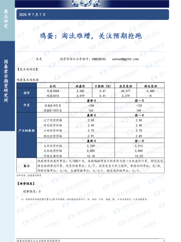 【国泰君安期货】【20250707】鸡蛋:淘汰难增,关注预期抢跑-2页 证券期货研究报告