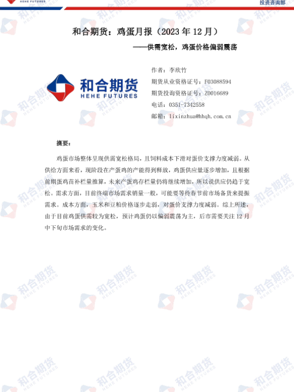 【和合期货】【20231201】鸡蛋月报(2023年12月):供需宽松,鸡蛋价格偏弱震荡-11页 行业研究