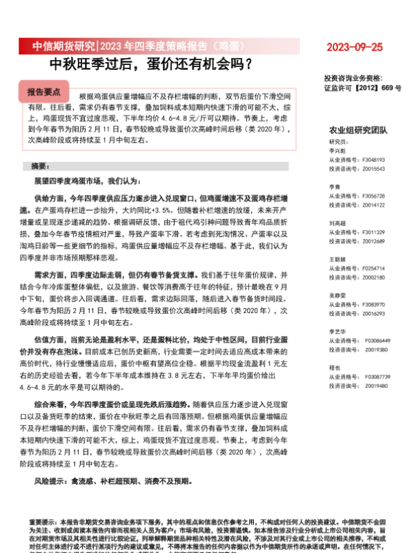 【中信期货】【20230925】2023年四季度策略报告(鸡蛋):中秋旺季过后,蛋价还有机会吗?-19页 行业研究