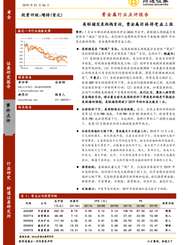 【财通证券】【20190106】贵金属行业点评报告:美联储发表极鸽言论,贵金属价格将受益上涨-2页 行业研究