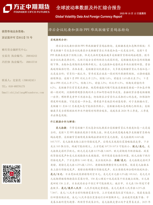 【方正中期期货】【20231012】全球波动率数据及外汇综合报告:滞后会议纪要和强劲PPI难改联储官员鸽派转向-18页 宏观策略