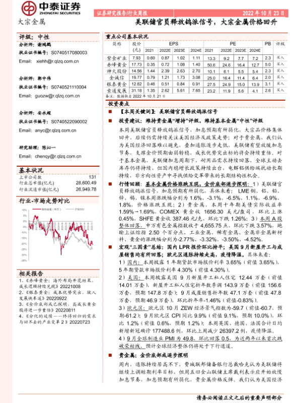 【中泰证券】【20221023】大宗金属行业周报:美联储官员释放鸽派信号,大宗金属价格回升-28页 行业研究