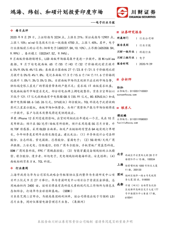 【川财证券】【20200929】电子行业日报:鸿海、纬创、和硕计划投资印度市场-5页 证券期货研究报告