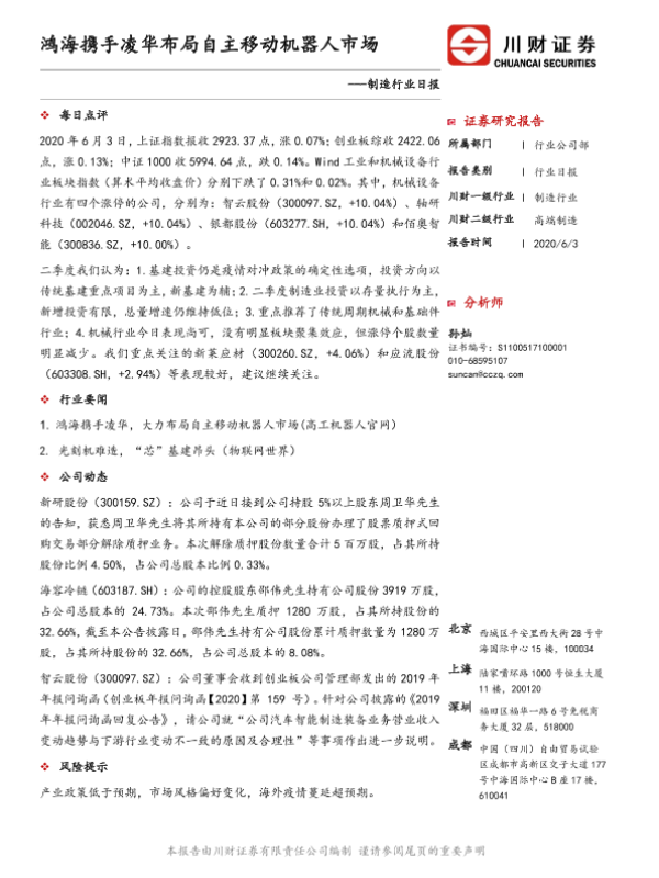 【川财证券】【20200603】制造行业日报:鸿海携手凌华布局自主移动机器人市场-2页 证券期货研究报告