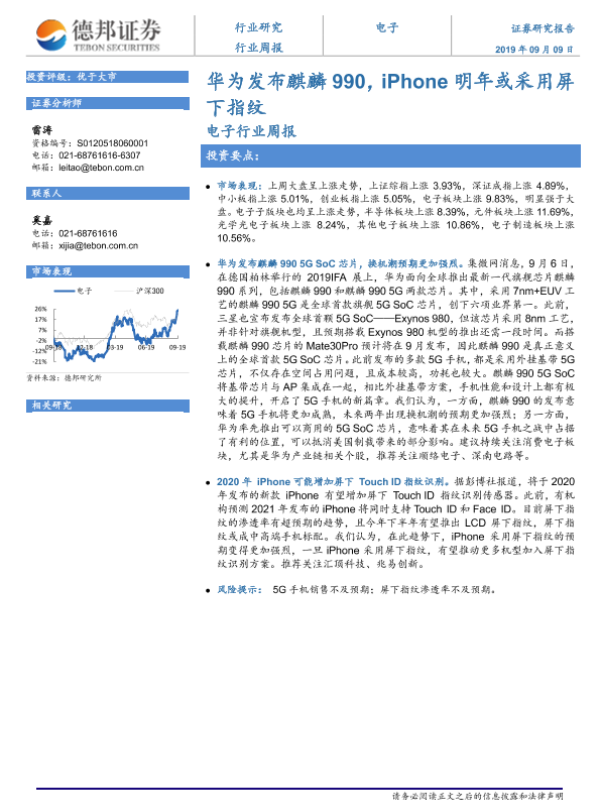 【德邦证券】【20190909】电子行业周报:华为发布麒麟990,iPhone明年或采用屏下指纹-4页 行业研究