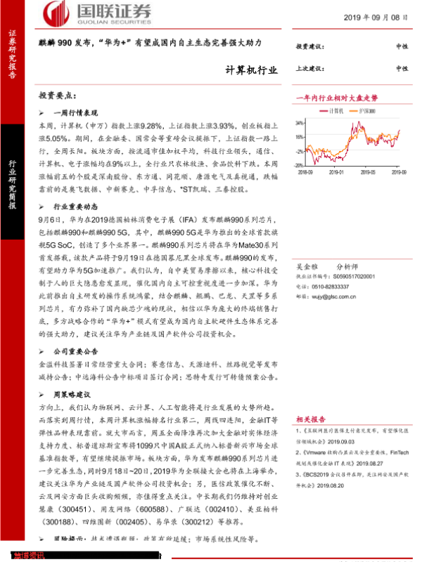 【国联证券】【20190908】计算机行业:麒麟990发布,“华为+”有望成国内自主生态完善强大助力-11页 行业研究
