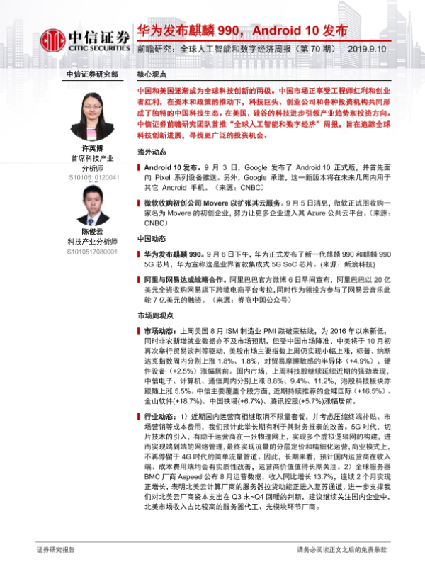 【中信证券】【20190910】全球人工智能和数字经济周报(第70期):华为发布麒麟990,Android10发布-12页 行业研究