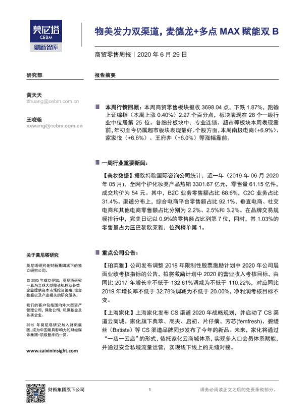 【莫尼塔研究】【20200629】商贸零售周报:物美发力双渠道,麦德龙+多点MAX赋能双B-7页 行业研究
