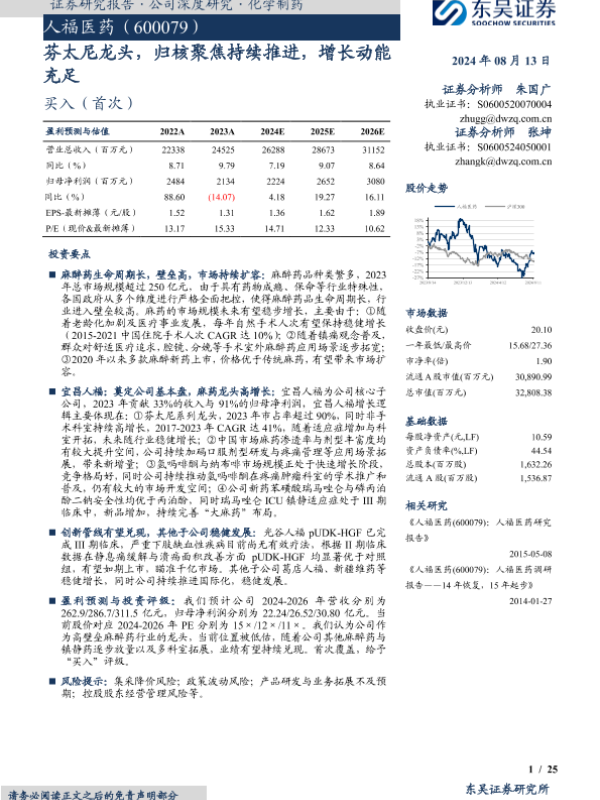 【东吴证券】【20240813】人福医药-芬太尼龙头,归核聚焦持续推进,增长动能充足-25页 行业研究