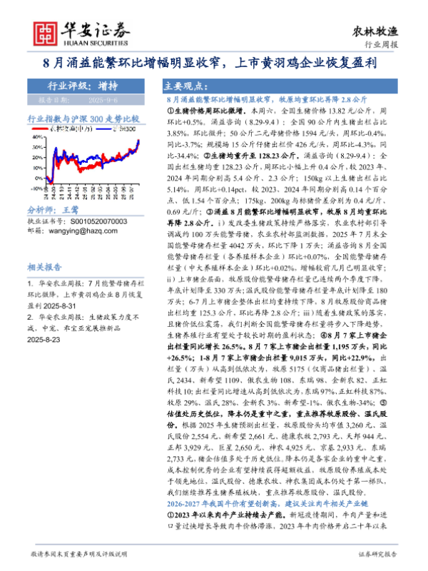 【华安证券】【20250830】农林牧渔行业周报:7月能繁母猪存栏环比微降-上市黄羽鸡企业8月恢复盈利-41页 证券期货研究报告