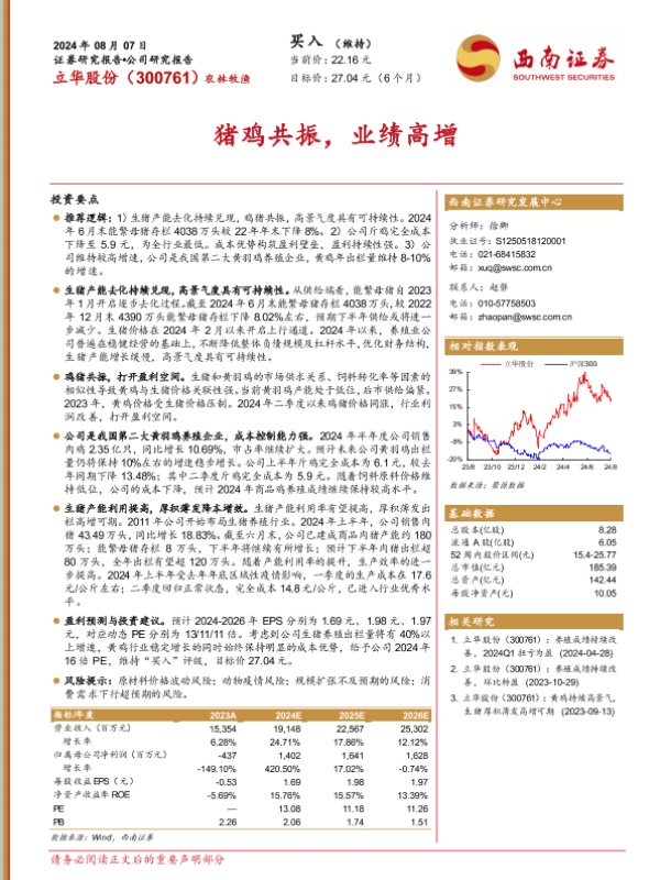 【西南证券】【20240807】猪鸡共振,业绩高增-20页 行业研究