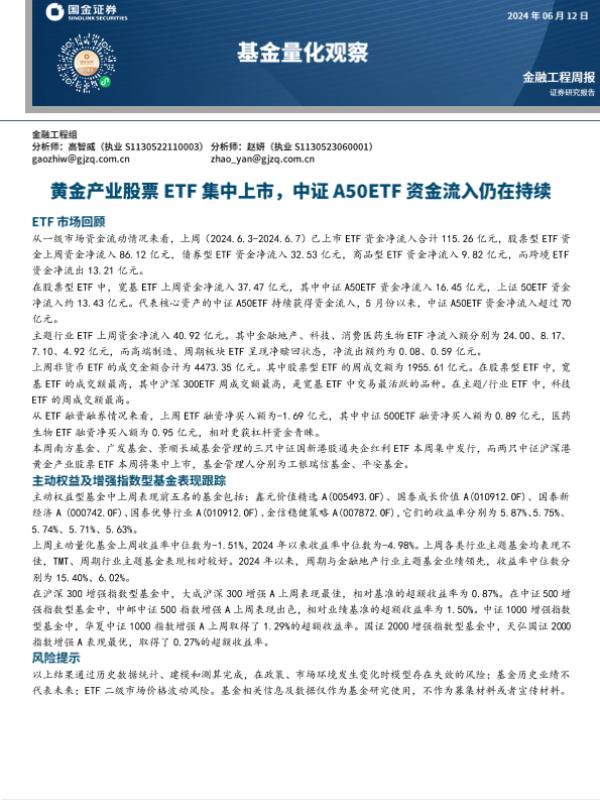 【国金证券】【20240612】基金量化观察:黄金产业股票ETF集中上市,中证A50ETF资金流入仍在持续-12页 行业研究
