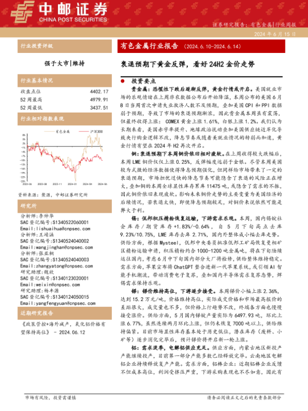 【中邮证券】【20240617】2024-06-17-有色金属行业报告-衰退预期下黄金反弹-看好24H2金价走势-14页 行业研究