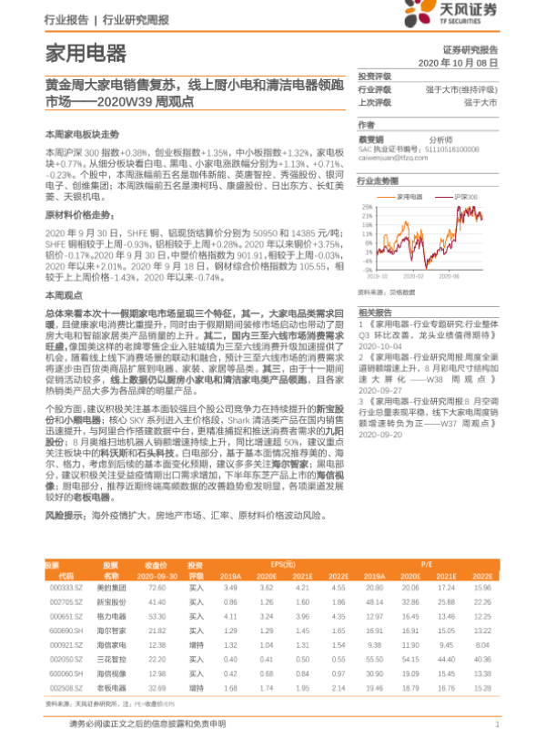 【天风证券】【20201008】家用电器2020W39周观点:黄金周大家电销售复苏,线上厨小电和清洁电器领跑市场-14页 行业研究