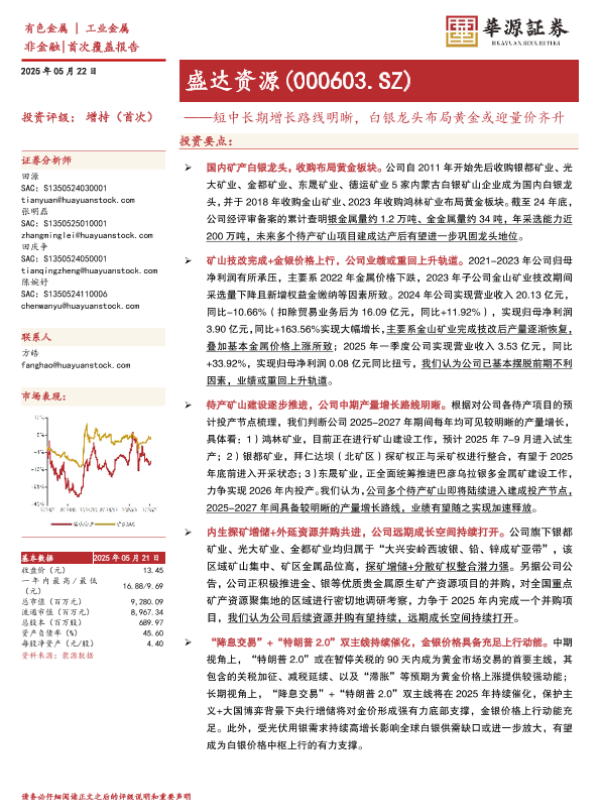 【华源证券】【20250522】盛达资源短中长期增长路线明晰,白银龙头布局黄金或迎量价齐升-20页 公司研究